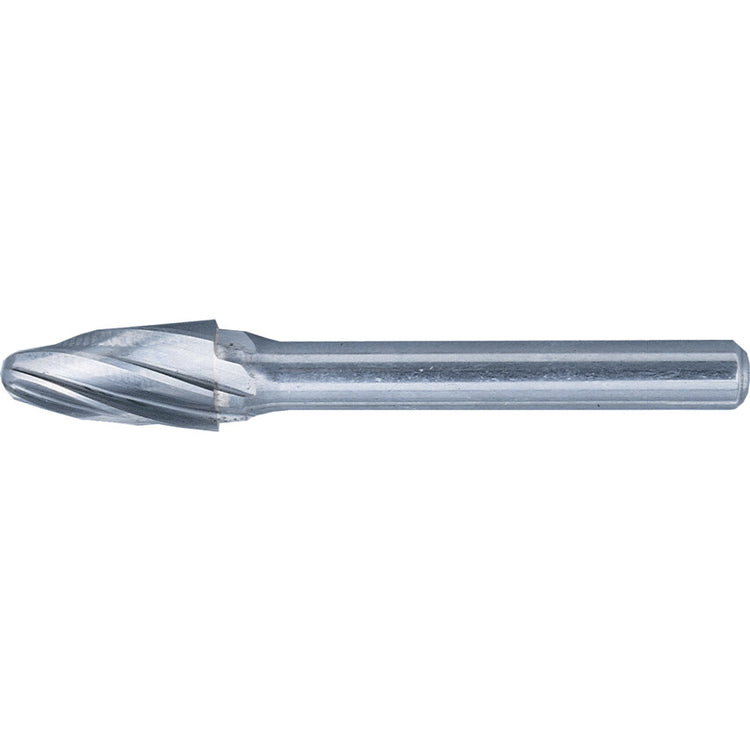 Round Tree All sizes are nominal. Sizes marked * are 3mm shank, all others are 6mm shank. Cut Numbers: Cut 3 - Rapid Cut For use on softer non-ferrous and plastic materials, i.e. aluminium, fibreglass, plastics, hard rubber and zinc alloy. Cut 9 - Chipbreaker Chipbreaker fast stock removal for improved control and reduced chips for use on hard materials, i.e. steel alloy 50RC, 60RC, carbon and cast iron. Suitable for deburring and polishing of cast iron, cast steel, carbon steel, alloy steel and stainless steel etc. up to HRC65 hardness. Please note: Workpiece and tools should always be steady and well supported. Carbide burrs are not suitable for 'milling' large amounts of material, they are for light stock removal at high rpm's 'LOW FEED - HIGH SPEED'. Always ensure that at least 70% of the shank length is clamped by the collet or chuck of the tool being used. Always ensure that the tool is rated to the recommended operating speed of the burr.