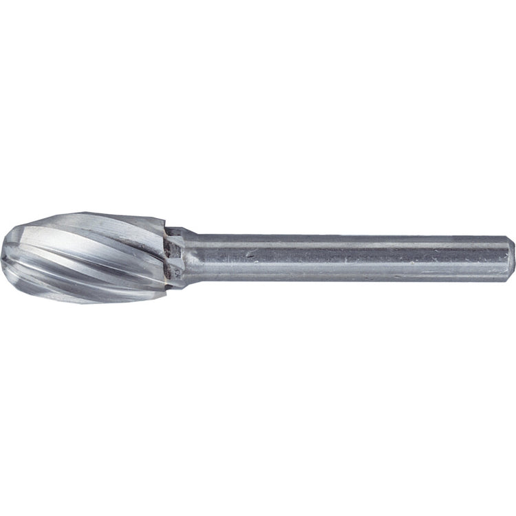 Oval Shape. All sizes are nominal. Sizes marked * are 3mm shank, all others are 6mm shank. Cut Numbers: Cut 3 - Rapid Cut For use on softer non-ferrous and plastic materials, i.e. aluminium, fibreglass, plastics, hard rubber and zinc alloy. Cut 9 - Chipbreaker Chipbreaker fast stock removal for improved control and reduced chips for use on hard materials, i.e. steel alloy 50RC, 60RC, carbon and cast iron. Suitable for deburring and polishing of cast iron, cast steel, carbon steel, alloy steel and stainless steel etc. up to HRC65 hardness. Please note: Workpiece and tools should always be steady and well supported. Carbide burrs are not suitable for 'milling' large amounts of material, they are for light stock removal at high rpm's 'LOW FEED - HIGH SPEED'. Always ensure that at least 70% of the shank length is clamped by the collet or chuck of the tool being used. Always ensure that the tool is rated to the recommended operating speed of the burr.