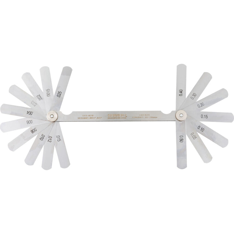 Hardened and polished taper blades enclosed in a steel case. Blades are clearly marked for easy reading and are manufactured to DIN 2275. Features and Benefits • Hardened and polished blades for increased tool life • Blades are clearly marked for easy readings • Supplied in a steel case for easy storage and portability Standards • DIN 2275 Notes • Blade length: (75mm/3") • Metric: (0.05mm - 0.5mm) • Inch: (0.0015" - 0.025")