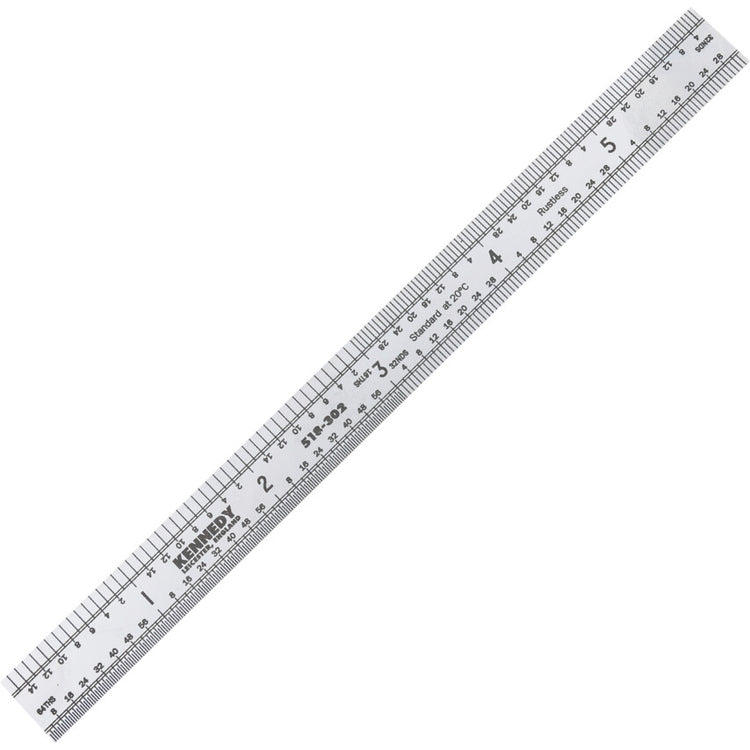 Engineer's spring tempered flexible steel blades. Made from the finest quality spring tempered stainless steel and finished in satin chrome. Anti-glare finish with permanent black figures and graduations. Features and Benefits • Tempered flexible steel blades for increased durability • Anti-glare finish with permanent black figures and graduations for easy reading • Square end complete with hanging hole for easy storage • Anti-rust for long tool lifespan Notes • Accuracy: ± 0.2mm full scale • Constant at 20°C • Metric - subdivided to 0.5mm and 1mm, figured every 10mm • subdivided to 1/16 inch, 1/32inch and 1/64inch, figured every inch *Image for illustration purposes only*