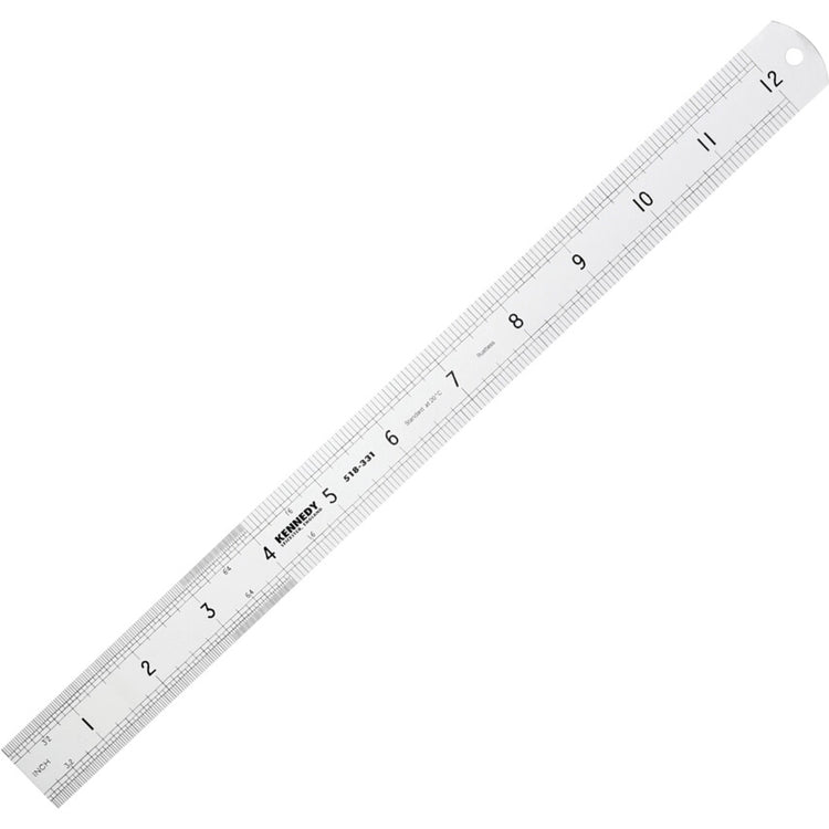 Our Kennedy® rigid steel rulers are made from the finest quality spring-tempered stainless steel and finished in satin chrome. They're flexible and durable with an anti-glare finish for use in any environment. Features and Benefits • Anti-glare finish for easy reading in all lighting levels • Permanent black figures and graduations allow for precise measurements • Round end complete with hanging hole for easy storage • Anti-rust for product longevity Standards • BS 4372:1968