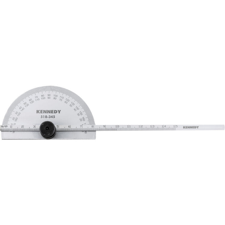 made from ground steel with graduations from 0° - 180° in both directions for fast and accurate measurements, the Kennedy protractor depth and angle gauge provides accurate measurements of depth when the rule is positioned to 90° on the protractor. Features and Benefits • Hardy ground steel construction • Accurate depth measurements thanks to angle measured by protractor Typical Applications • On site • Workshop Notes • Rule Length: 150mm (6")