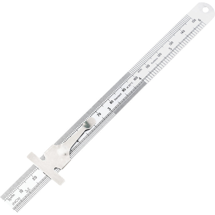Featuring spring tempered stainless steel blades and a 13mm blade width with pocket clip/depth gauge slide. Reverse side is marked with 1/64" to mm conversion table. 12mm blade width. Can also be used as a depth gauge. Conforms to EEC Class 1. Features and Benefits • Spring tempered stainless steel blades for added durability • With anti-glare finish and permanent black markings for easy reading • Reverse side is marked with 1/64" to mm conversion table for both imperial and metric applications • Can also be used as a depth gauge Typical Applications • Engineering • Workshop • On-site Standards • EEC Class one