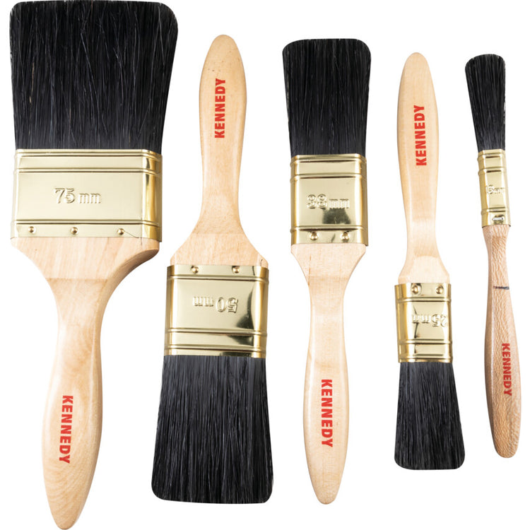 This set of 5 brushes contains metric sized, hard wearing brushes that are designed to give long life and the finest of finishes for the true craftsman. With high quality lacquered wood handles, chrome plated lapped and pressed ferrules and long, pure black, high quality bristles. Features and Benefits • Wood handles are comfortable and designed for long use • Lacquered finish on the handles protects the product from wear and tear and improves user comfort and grip • Natural black bristles provide a smooth and seamless finish • Chrome plated ferrule effectively holds the bristles in place and reduces bristle loss • Set of 5 ensures you have the right sized brush to hand no matter the application Contents • 1x 13, 25, 38, 50 and 75mm Typical Applications • Crafts • Painting & Decorating • DIY