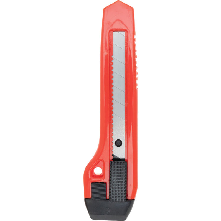 Featuring a high strength ABS plastic construction, this knife has a retractable 8 segment snap-off blade, integral blade snapper and auto lock. The multi-segment blade allows you to easily dispose of that segment once it has become blunt, to quickly begin using the fresh segment below. Features and Benefits • Manufactured from ABS plastic for strength and resistance to wear and tear • Auto lock feature allows you to hold the blade in place whilst in use • 8 segment blade to ensure you get plenty of usage out of the product • Easy snap off once each segment has been used until blunt Typical Applications • Ideal for craft uses as well as general purpose cutting of cardboard and paper