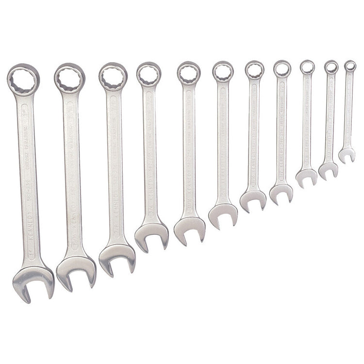This comprehensive, precision made set of combination spanners are manufactured from drop forged carbon steel with a satin finish and highly polished heads. They feature a 15° open jaw angle to shank and ring end offset. Features and Benefits • Set of 11 • drop forged carbon steel for a lightweight, yet durable build • Variety of sizes for high versatility Conform to: 1-1/16 inch - 2 inch - ASME B107.6. Contents 1-1/16", 1-1/8", 1-1/4", 1-5/16", 1-3/8", 1-7/16", 1-1/2", 1-5/8", 1-3/4", 1-7/8" and 2". 3 Year Warranty For further information please visit our Kennedy® warranty page