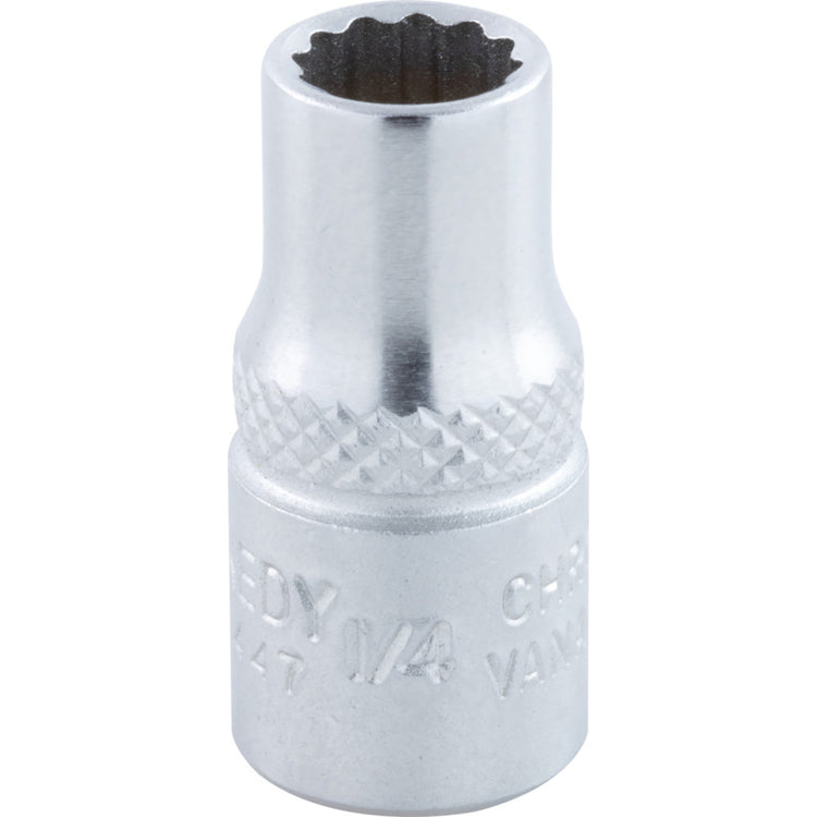 Ideal for assembly and servicing of small precision mechanisms associated with electrical, electronic, ignition and refrigeration work, these 1/4in square drive sockets are available in a range of AF sizes. Each socket possesses a double knurl feature, a 12 point bi-hexagon side drive design that enables higher torque than normal sockets and an aluminium free, chrome plated mirror finish. All sockets are manufactured from chrome vanadium steel and have a chamfered leading edge ensures easy fastener location. Features and Benefits • Aluminium free construction makes the sockets suitable for use in non-sparking applications • 12 point bi-hexagon side drive design allows you to deliver a higher torque than standard single hexagon sockets • Double knurl feature allows for a rapid component change even when hands are oily or greasy • Highly polished, mirror finish repels dirt and grime ensuring an easy tool clean • Chamfered leading edge ensures an easy fastener location • Chrome plated finish protects the sockets from corrosion as well as wear and tear • Manufactured from chrome vanadium steel for optimum resilience • Available in a range of AF sizes to suit your requirements and applications