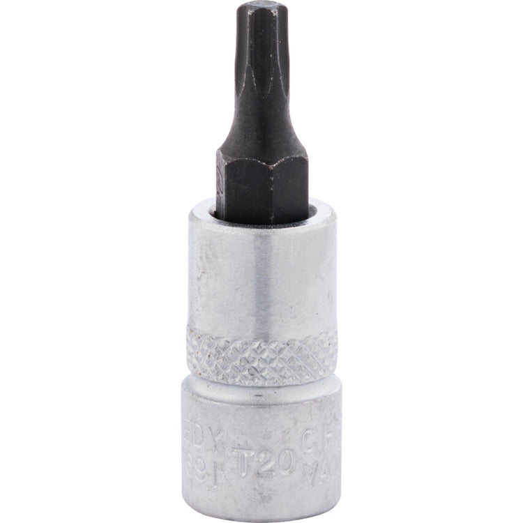 These Torx screwdriver bits are ideal for assembly and servicing of small precision mechanisms associated with electrical, electronic, ignition and refrigeration work. Each component boasts a double knurl feature that gives a high grip which is essential for a quick tool change when your hands are greasy/oily. The 12 point bi-hexagon side drive design will give a higher torque than normal sockets. Manufactured from chrome vanadium, fully chrome plated with a mirror finish and aluminium-free to ensure non-sparking. Chamfered leading edge ensures easy fastener location. Available in a range of sizes. Features and Benefits • Available in a range of sizes to suit your requirements • Manufactured from chrome vanadium steel for durability • Double knurl features makes for a quick tool change even with greasy or oily hands • 12 point bi-hexagon side drive allows you to deliver more torque than an average design • Chamfered edge ensures an easy fastener location • Aluminium free construction ensures non sparking for ultimate safety • Fully polished finish repels dirt and grime and makes for an easy component clean