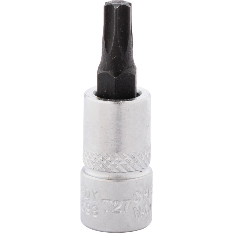 These Torx screwdriver bits are ideal for assembly and servicing of small precision mechanisms associated with electrical, electronic, ignition and refrigeration work. Each component boasts a double knurl feature that gives a high grip which is essential for a quick tool change when your hands are greasy/oily. The 12 point bi-hexagon side drive design will give a higher torque than normal sockets. Manufactured from chrome vanadium, fully chrome plated with a mirror finish and aluminium-free to ensure non-sparking. Chamfered leading edge ensures easy fastener location. Available in a range of sizes. Features and Benefits • Available in a range of sizes to suit your requirements • Manufactured from chrome vanadium steel for durability • Double knurl features makes for a quick tool change even with greasy or oily hands • 12 point bi-hexagon side drive allows you to deliver more torque than an average design • Chamfered edge ensures an easy fastener location • Aluminium free construction ensures non sparking for ultimate safety • Fully polished finish repels dirt and grime and makes for an easy component clean