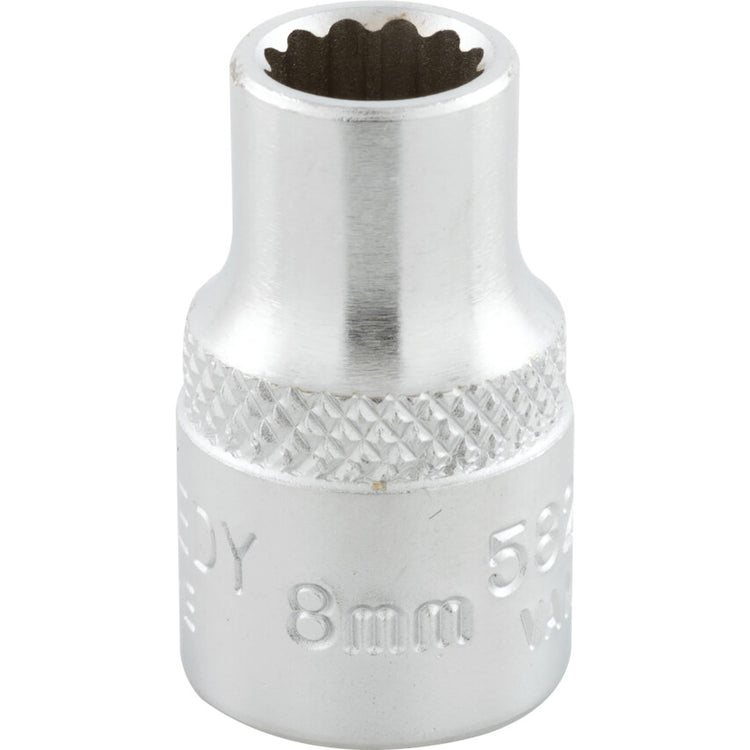 Available in metric sizes, these 3/8" square drive, bi-hexagonal sockets are ideal for applications in which high torque is required. With a 12 point system and side drive design, each socket gives a higher torque than normal sockets, can grip worn nuts and will not round off existing nuts. Every socket possesses a ball-retaining groove on each face of the square drive and requires only a one-twelfth turn to engage the next point of the socket. Constructed from chrome vanadium steel with a highly polished, chrome plated, mirror finish. Features and Benefits • Ball retaining groove on each face of the drive ensures a positive fit with accessories • 12 point design requires only a twelfth of a turn to engage with the next point of the socket for easy fastening and loosening • Will grip even worn nuts and won't round off existing nuts • Side drive design gives a higher torque than standards sockets • Available in a range of metric sizes to suit your requirements • Chrome vanadium steel construction is robust and bolsters product longevity • Mirror finish repels grime and dirt and makes each socket easier to clean