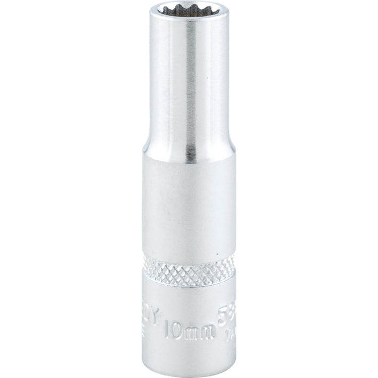 Available in a range of metric sizes, these 3/8" square drive, bi-hexagon deep sockets offer superior torque with minimal user exertion. Manufactured from chrome vanadium steel and complete with a chrome-plated, polished mirror finish. With a 12 point side and side drive, the deep socket gives a higher torque than normal sockets, grips worn nuts and will not round off existing nuts. Each socket possesses a ball-retaining groove on each face of the square drive, which ensures a positive fit with accessories. Requires only a one-twelfth turn to engage the next point of the socket. Features and Benefits • Manufactured from durable chrome vanadium steel for longevity • Polished mirror finish repels dirt and grime • Require only one-twelfth of a turn to engage the next part of the socket for quick fastening and loosening of nuts • Ball retaining groove ensures a positive fit with accessories and reduces slippage • 12 point and side drive allows you to deliver more torque than a standard socket