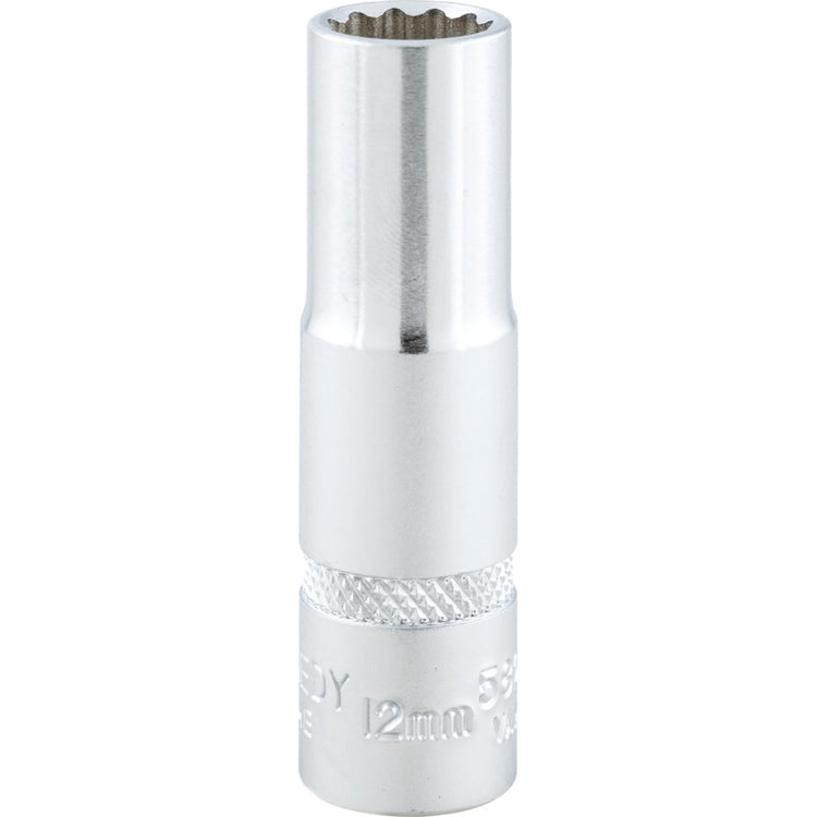 Available in a range of metric sizes, these 3/8" square drive, bi-hexagon deep sockets offer superior torque with minimal user exertion. Manufactured from chrome vanadium steel and complete with a chrome-plated, polished mirror finish. With a 12 point side and side drive, the deep socket gives a higher torque than normal sockets, grips worn nuts and will not round off existing nuts. Each socket possesses a ball-retaining groove on each face of the square drive, which ensures a positive fit with accessories. Requires only a one-twelfth turn to engage the next point of the socket. Features and Benefits • Manufactured from durable chrome vanadium steel for longevity • Polished mirror finish repels dirt and grime • Require only one-twelfth of a turn to engage the next part of the socket for quick fastening and loosening of nuts • Ball retaining groove ensures a positive fit with accessories and reduces slippage • 12 point and side drive allows you to deliver more torque than a standard socket