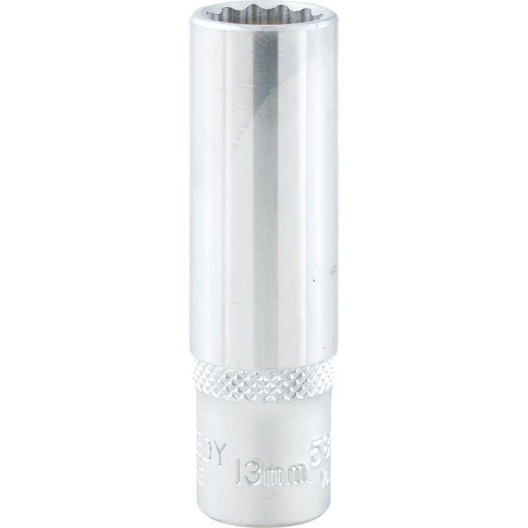 Available in a range of metric sizes, these 3/8" square drive, bi-hexagon deep sockets offer superior torque with minimal user exertion. Manufactured from chrome vanadium steel and complete with a chrome-plated, polished mirror finish. With a 12 point side and side drive, the deep socket gives a higher torque than normal sockets, grips worn nuts and will not round off existing nuts. Each socket possesses a ball-retaining groove on each face of the square drive, which ensures a positive fit with accessories. Requires only a one-twelfth turn to engage the next point of the socket. Features and Benefits • Manufactured from durable chrome vanadium steel for longevity • Polished mirror finish repels dirt and grime • Require only one-twelfth of a turn to engage the next part of the socket for quick fastening and loosening of nuts • Ball retaining groove ensures a positive fit with accessories and reduces slippage • 12 point and side drive allows you to deliver more torque than a standard socket