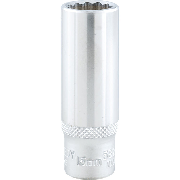 Available in a range of metric sizes, these 3/8" square drive, bi-hexagon deep sockets offer superior torque with minimal user exertion. Manufactured from chrome vanadium steel and complete with a chrome-plated, polished mirror finish. With a 12 point side and side drive, the deep socket gives a higher torque than normal sockets, grips worn nuts and will not round off existing nuts. Each socket possesses a ball-retaining groove on each face of the square drive, which ensures a positive fit with accessories. Requires only a one-twelfth turn to engage the next point of the socket. Features and Benefits • Manufactured from durable chrome vanadium steel for longevity • Polished mirror finish repels dirt and grime • Require only one-twelfth of a turn to engage the next part of the socket for quick fastening and loosening of nuts • Ball retaining groove ensures a positive fit with accessories and reduces slippage • 12 point and side drive allows you to deliver more torque than a standard socket