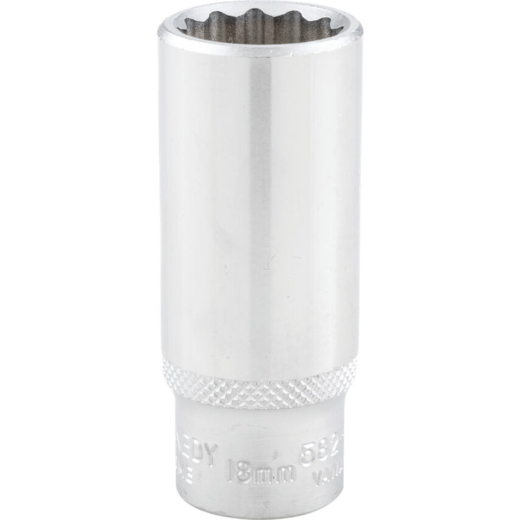 Available in a range of metric sizes, these 3/8" square drive, bi-hexagon deep sockets offer superior torque with minimal user exertion. Manufactured from chrome vanadium steel and complete with a chrome-plated, polished mirror finish. With a 12 point side and side drive, the deep socket gives a higher torque than normal sockets, grips worn nuts and will not round off existing nuts. Each socket possesses a ball-retaining groove on each face of the square drive, which ensures a positive fit with accessories. Requires only a one-twelfth turn to engage the next point of the socket. Features and Benefits • Manufactured from durable chrome vanadium steel for longevity • Polished mirror finish repels dirt and grime • Require only one-twelfth of a turn to engage the next part of the socket for quick fastening and loosening of nuts • Ball retaining groove ensures a positive fit with accessories and reduces slippage • 12 point and side drive allows you to deliver more torque than a standard socket