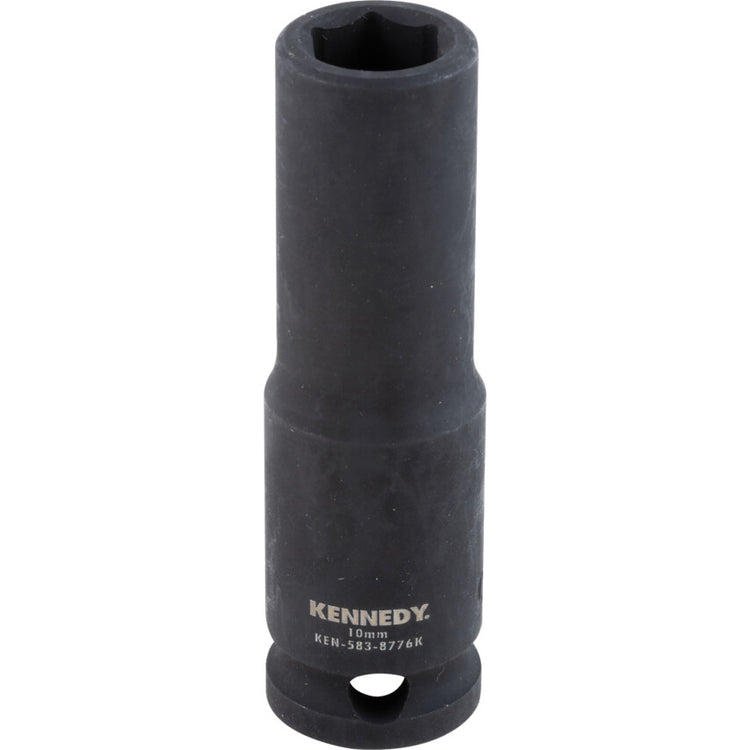 Constructed from chrome high quality molybdenum alloy steel with a black oxidised finish, these 3/8in. drive deep impact sockets from Kennedy® are a must have for your toolkit. Features and Benefits • Sizes are permanently laser etched onto each socket for easy selection • Black oxidised finish resists wear and bending • Quality material delivers a long lasting and reliable product Standards • DIN 3129