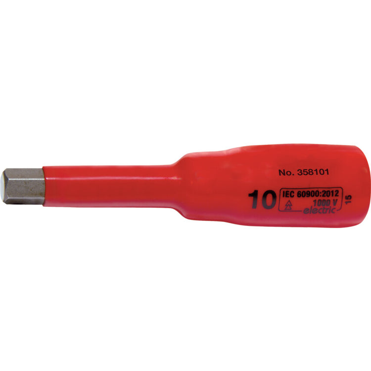 These Kennedy® Inhex Insulated Hexagonal Sockets with a 1/2 inch square drive are designed for safety in live electrical environments. Manufactured to IEC 60900 standards, each socket is insulated to protect against voltages up to 1000V. Socket sizes range from 4mm to 10mm, making them suitable for a wide range of electrical applications. Features and Benefits • 1/2 inch square drive ensures compatibility with common tooling • Inhex hexagonal profile for secure engagement with fasteners • Dual-layer dipped insulation provides protection against up to 1000 volts • Clearly marked socket size and type for fast identification Standards • Conforms to IEC 60900 for safety in live working conditions