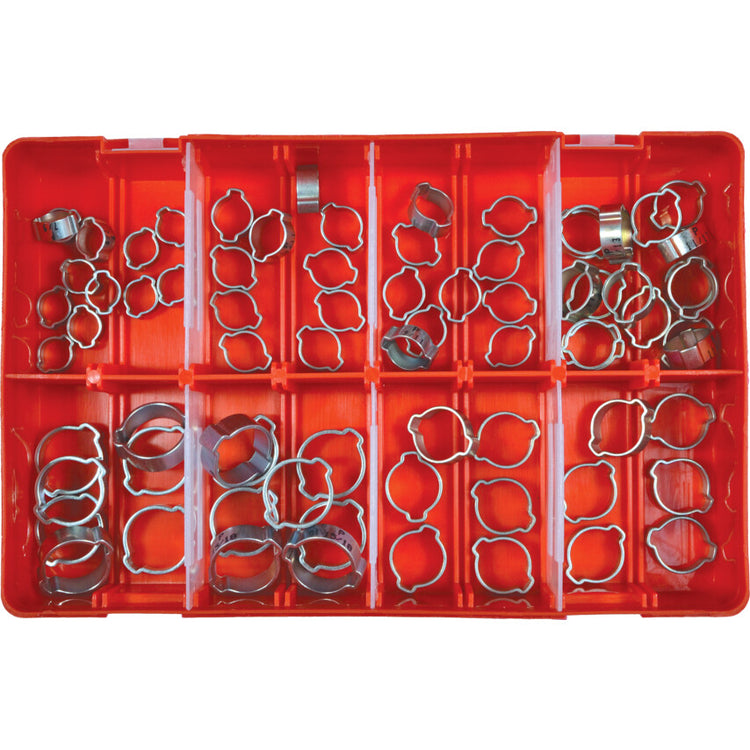 Made from zinc-plated mild steel, this set of double ear o-clips contains 75 pieces with a range of sizes from 9T to 18T. For use on rubber hoses, plastic tubing, coaxial and electrical cables, the product is designed primarily for use on air, fluid, gas and steam lines as well as low pressure hydraulics applications. Features and Benefits • Manufactured from mild steel for ultimate durability • Bright Zinc Plating (BZP) protects the product from corrosion • Set contains an array of sizes to suit multiple and varied applications • Supplied in a plastic storage case to help keep your clips organised Contents • 12 x 7-9mm • 20 x 9-11mm • 16 x 11-13mm • 12 x 13-15mm • 15 x 15-18mm Typical Applications • Workshops • Automotive • Agricultural • Engineering Standards • BS 5315:1991 • DIN 3017
