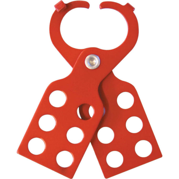 Made from hardened powder coated steel. The hasp utilises a standard scissor action to isolate a machine. With a double locking arrangement. Accepts padlocks: shackle clearance 20mm, shackle diameter 10mm.