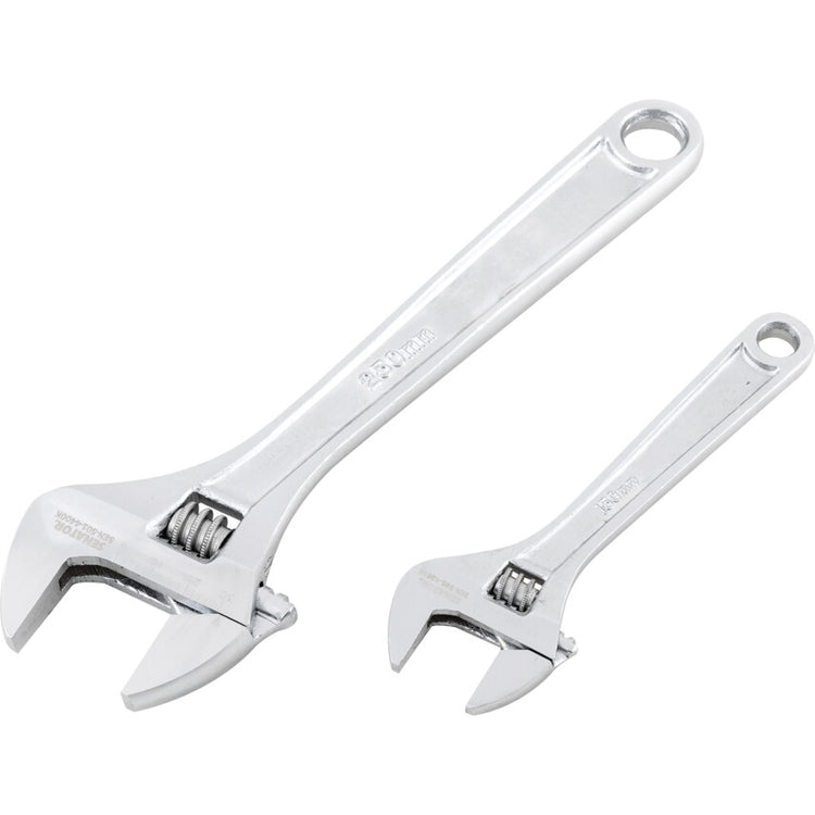 This set of 2 metric sized adjustable spanners are suited for general purpose professional use. Possessing tapered jaws for improved access into confined spaces, a smooth jaw adjustment and a graduated laser etched scale on the jaw for fast jaw setting. Manufactured from chromed drop forged steel. Features and Benefits • Graduated laser etched jaws allow for fast setting and accurate gripping • Tapered jaws allow access to even confined spaces • Manufactured from drop forged steel with a chrome finish for durability and resistance to corrosion • Set of two ensures you have various sized tools to hand no matter the application Typical Applications • Automotive • Engineering • DIY • Construction