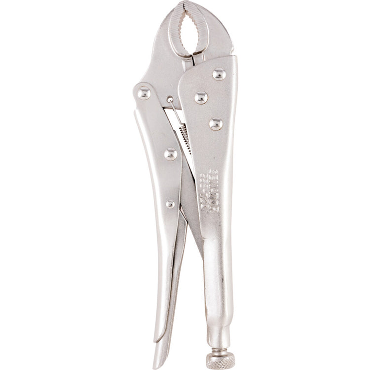 These high strength curved jaw grip wrenches are manufactured from rolled chrome vanadium steel with serrated drop forged hardened steel jaws for a positive high strength grip. The body of the grip wrench is coated with a corrosion resistant bright nickel finish and the jaw opening and clamping pressure can be adjusted as required turning the knurled head screw adjuster. Each wrench is fitted with a wire spring to ensure efficient jaw opening. The locking mechanism holds the wrench in place once adjusted, leaving both hands free. Features and Benefits • Knurled headed screw allows you to adjust the clamping pressure of the product • Bright nickel finish improves the corrosion resistance of the product for overall product longevity • Locking mechanism can effectively hold the wrench in place for hands free use • Manufactured from chrome vanadium steel for durability • Available in two sizes to suit your requirements Typical Applications • DIY • Plumbing • Construction