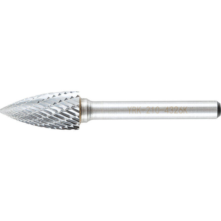 These Pointed Tree carbide rotary burrs are designed for low feed, high speed applications, removing light stock quickly and efficiently. The Chipbreaker Cut 9 style allows the burrs to remove stock with improved control and a reduction in chips. SUited for use on hard materials such as steel alloys, carbon and cast iron up to 65 HRC. All sizes are nominal with a 6mm shank unless otherwise stated. Features and Benefits • Cut 9 chipbreaker makes for faster stock removal • Chipbreaker design offers improved control and reduced chips when cutting • Available in a variety of sizes to suit your needs • Designed for use on hard materials up to 65 HRC in low feed, high speed applications Typical Applications • Suitable for deburring and polishing of cast iron, cast steel, carbon steel, alloy steel and stainless steel up to 65 HRC hardness Notes • Work piece and tools should always be steady and well supported. • Always ensure that at least 70% of the shank length is clamped by the collet or chuck of the tool being used • Always ensure that the tool is rated to the recommended operating speed of the burr