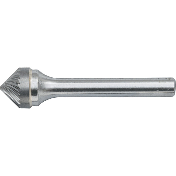 Conical 90° Inc. Angle. All sizes are nominal with a 6mm shank unless other wise stated. Cut Numbers: Cut 6 - Double Cut. Crosscut and double cut to improve control and chipbreaks. Manufactured from high grade tungsten carbide for general-purpose use. Cut 9 - Chipbreaker Chipbreaker fast stock removal for improved control and reduced chips for use on hard materials, i.e. steel alloy 50RC, 60RC, carbon and cast iron. Suitable for deburring and polishing of cast iron, cast steel, carbon steel, alloy steel and stainless steel etc. up to HRC65 hardness. Please note: • Work piece and tools should always be steady and well supported. • Carbide burrs are not suitable for 'milling' large amounts of material, they are for light stock removal and high revolutions 'LOW FEED - HIGH SPEED'. • Always ensure that at least 70% of the shank length is clamped by the collet or chuck of the tool being used. • Always ensure that the tool is rated to the recommended operating speed of the burr.