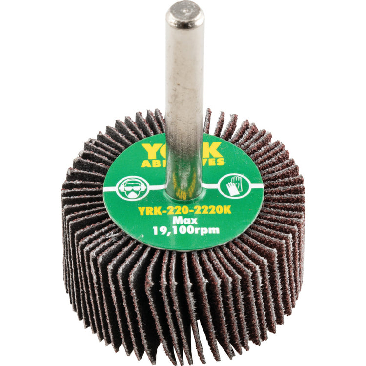 Shaft mounted flap wheels can be used in portable air or electric power tools, including die grinders, flexible shafts and drills. Used for a wide range of applications such as removal of rust, cleaning up welds and sanding wood prior to painting. Features and Benefits • Recessed hub design for maximum access in tight corners • Highly efficient design • Durable construction means the flap wheels last longer than others on the market Typical Applications • Final finishing of metal surfaces • Miss-match removal and de-burring on machined components. • Blending and finishing tool, tubes, dies, moulds, channels • Edge blending and cleaning. Surface preparation prior to painting and plating • Can be used on metals, woods, plastic and fibreglass Notes • Images are for illustration purposes only
