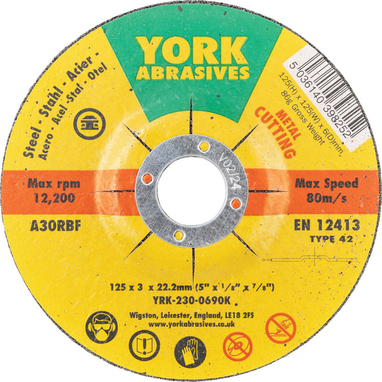 York Cutting Disc, 30-Medium/Coarse, 125 x 3 x 22.23 mm, Type 42, Aluminium Oxide