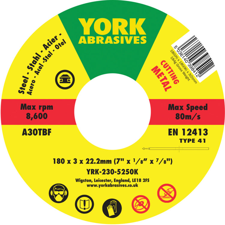 York Cutting Disc, 30-Medium/Coarse, 180 x 3 x 22.23 mm, Type 41, Aluminium Oxide