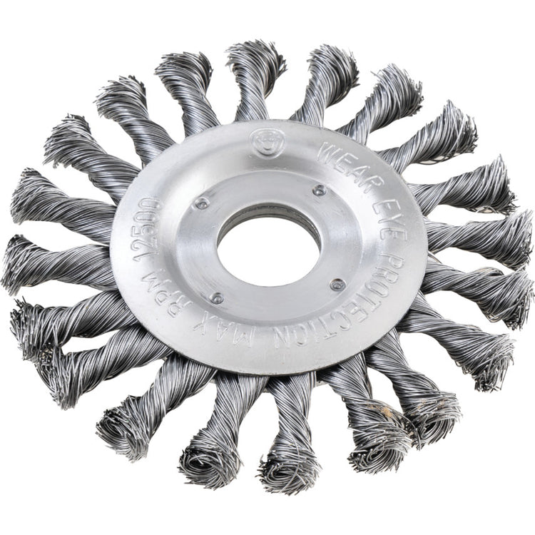 Twisted wire wheel brushes feature wire ends in twisted bundles that help provide excellent strength and very aggressive brushing. Models are available for cleaning and remove rust, corrosion, and paint from metal surfaces. Arbor Hole Mount models attach to compatible arbors for use with power tools and machines (available separately). Features and Benefits • Class-leading strength • Perfect for cleaning as well as removing rust and paint from metal surfaces • Highly durable steel wire bristles