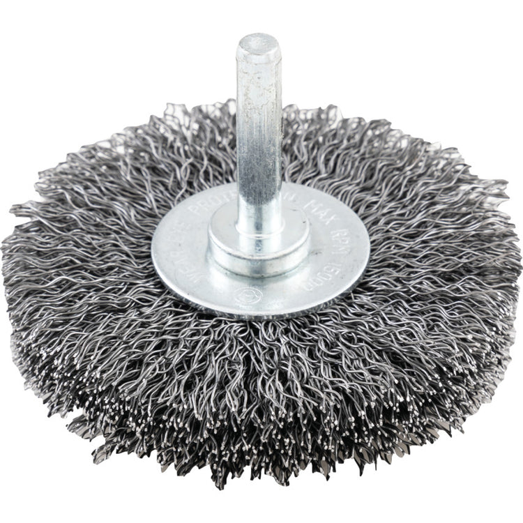 Circular brushes with shaft are small diameter brushes and are good to be used for drill machines. Normally the RPM is 4500. It's good for both Professional and do-it-yourself work. Features and Benefits • High quality, durable crimped wire bristles • Provides a safe, secure fit Typical Applications: • Remove paint and other coatings, including rust and scale from all types of steel work-pieces and oxide layers from stainless-steel and non-ferrous metals • Creating metallic cleaning surfaces • Cleaning tool dies • De-burring castings • Matt finishing of metal surfaces