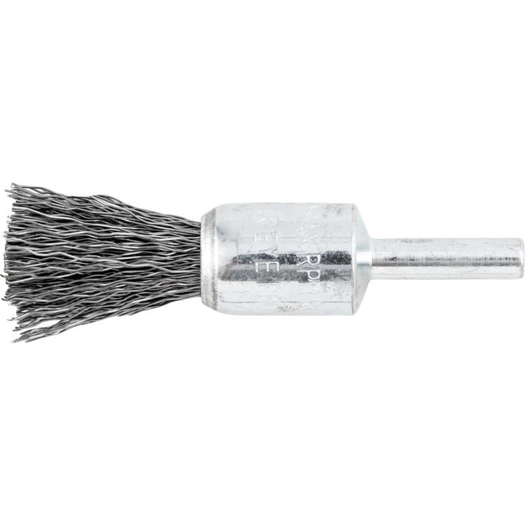 Crimped wire flat end de-carbonising brushes are designed for hard to reach areas such as drilled holes, recesses and corners. These wire brushes removes of burrs, rust and paint. Features and Benefits • Very flexible in use to get into those hard to reach places