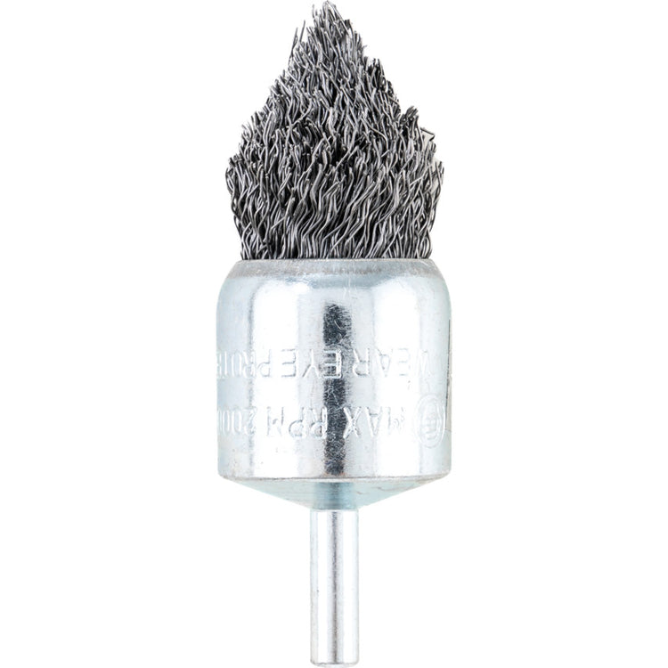 Crimped wire pointed end de-carbonising brushes are designed for hard to reach areas such as drilled holes, recesses and corners. These wire brushes removes of burrs, rust and paint. Features and Benefits • Very flexible in use to get into those hard to reach places